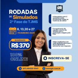 OnlineA Escola Superior da Magistratura de Mato Grosso do Sul (ESMAGIS), em parceria com a Associação dos Magistrados do Estado de Mato Grosso do Sul (AMAMSUL), promove as Rodadas de Simulados para a 2ª Fase do TJMS, com foco em treinamento prático, estratégia de resposta e adequação aos critérios da banca examinadora.