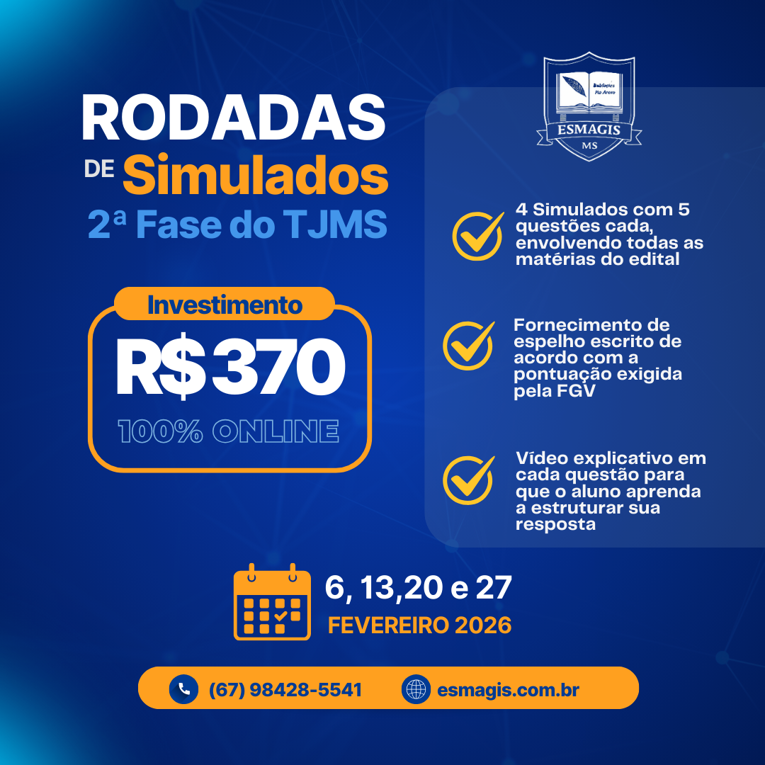 A Escola Superior da Magistratura de Mato Grosso do Sul (ESMAGIS), em parceria com a Associação dos Magistrados do Estado de Mato Grosso do Sul (AMAMSUL), promove as Rodadas de Simulados para a 2ª Fase do TJMS, com foco em treinamento prático, estratégia de resposta e adequação aos critérios da banca examinadora.
