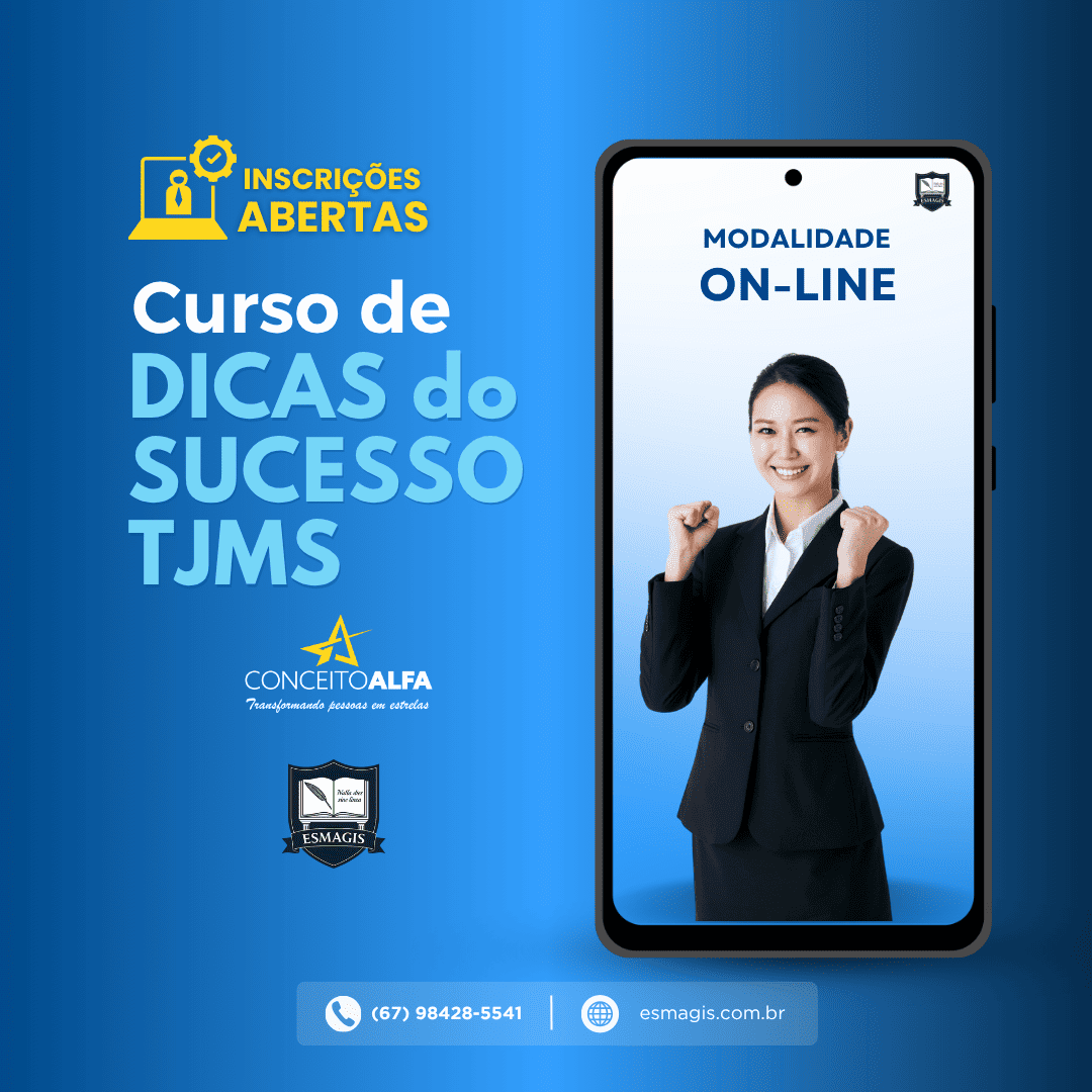 A Escola Superior da Magistratura de Mato Grosso do Sul (ESMAGIS) e a Associação dos Magistrados do Estado de Mato Grosso do Sul (AMAMSUL), em parceria com o Curso Conceito Alfa, tornam público que estarão abertas, no período de 27 de outubro de 2025 a 07 de janeiro de 2026, as inscrições para o Curso Dicas do Sucesso TJMS, com turmas noturnas presenciais e online (ao vivo e gravadas), conforme as condições a seguir: